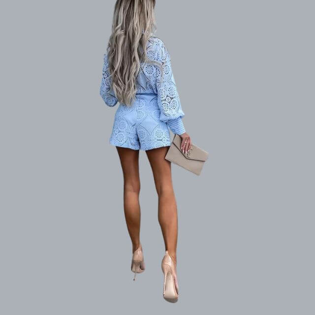 Dieses Avelina-Set mit Spitzenstickerei und Kordelzug ist der Inbegriff sommerlicher Eleganz. Mit Stehkragen und doppellagigen A-Linien-Shorts besticht das Set durch aufwendige Hohlspitzenstickereien für einen zarten und raffinierten Look – perfekt für einen lässigen Urlaub. Die Kombination aus bequemer Bluse und passenden Shorts verleiht dem zweiteiligen Set einen entspannten und dennoch raffinierten Stil für jeden gemütlichen Ausflug.