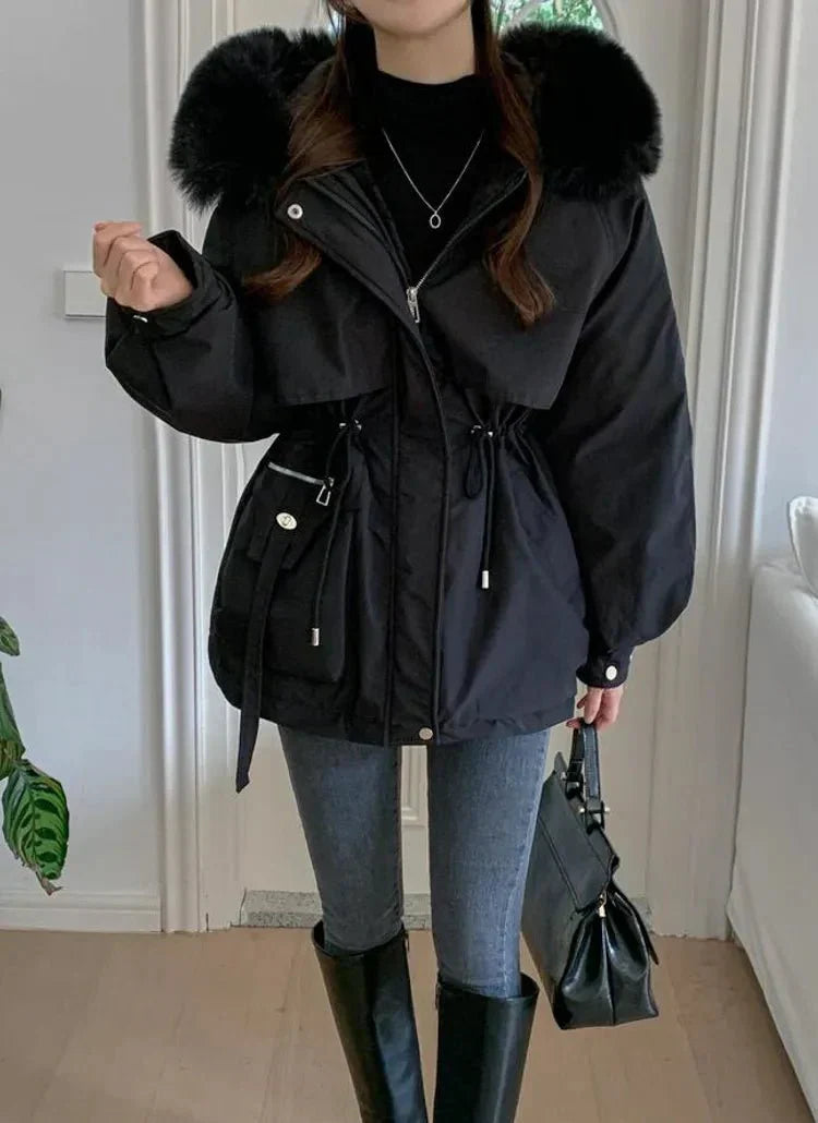 Whitley | Stylischer Cinch-Taillenmantel mit Pelzkapuze